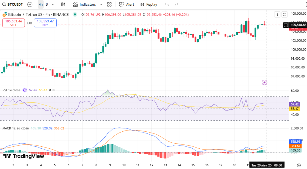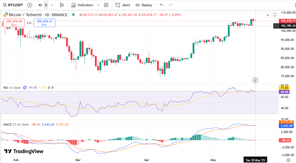 تحلیل تکنیکال بیت کوین با قیمت فعلی 105,549.43 USDT.