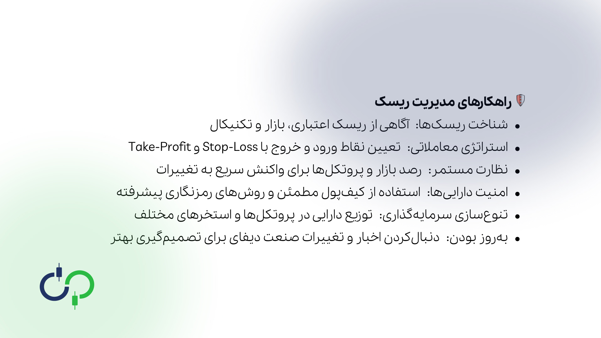 برای مدیریت این ریسک‌ها، لازم است ابتدا شناخت دقیقی از انواع ریسک‌ها، از جمله ریسک‌های اعتباری، بازار، و تکنیکالی وجود داشته باشد.